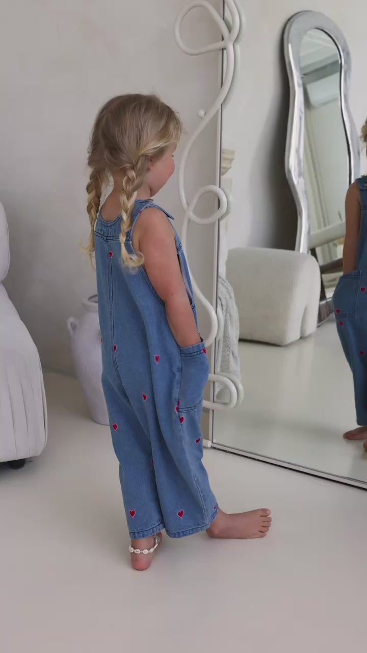 Our Best Selling Denim Barrel Overall now feature our signature heart embroidery, adjustable snap buttons, round neckline and has functional pockets. It has a similar barrel shape to our viral Yarra Barrel Jean. Also features tan contrast stitching.