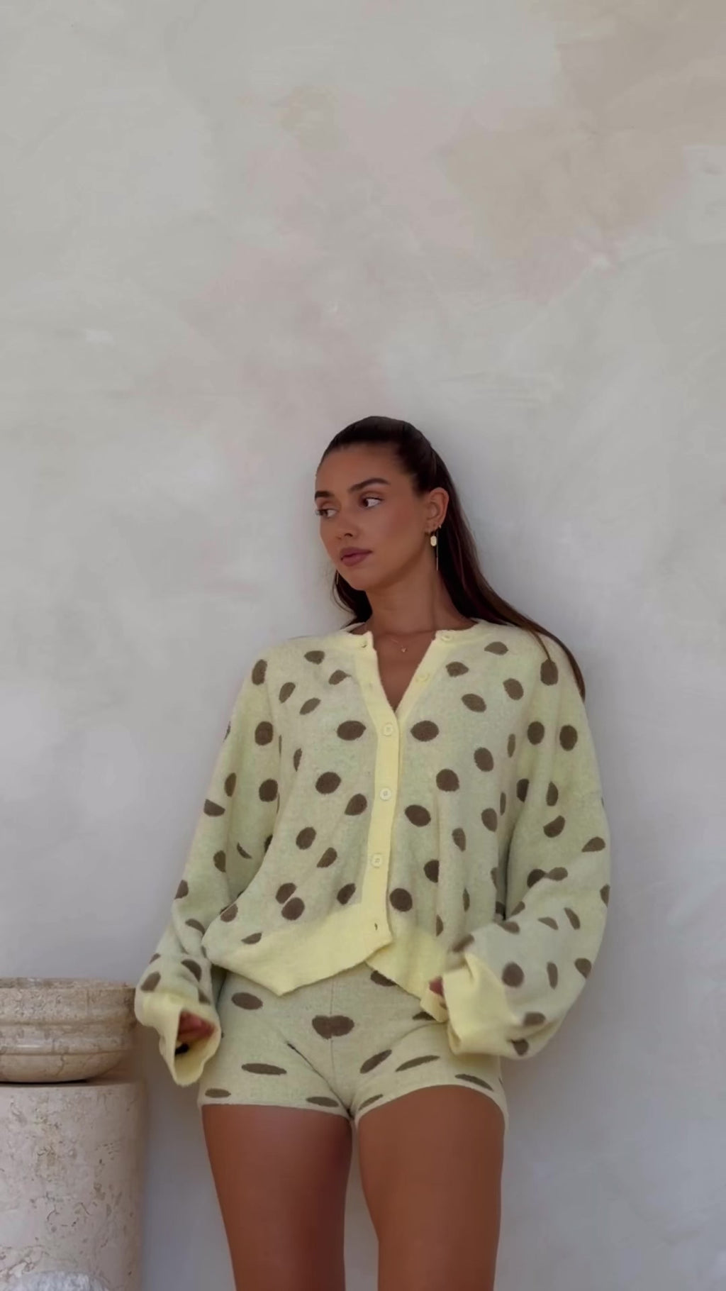 Our gorgeous DOTTIE Cardigan is made from the softest WEAVE. It is a oversized fit knit cardigan. It features jacquard dotsall over . Perfectly paired with our  matching biker shorts.